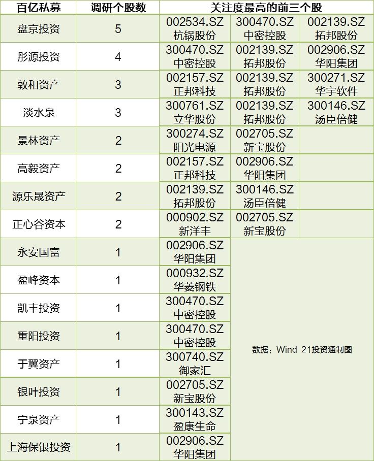 值得注意的是,一向低调的社保基金现身在华阳集团调研机构的队伍中,而拓邦股份也吸引了包括淡水泉、高毅资产、盘京投资等5家知名百亿私募现身调研。