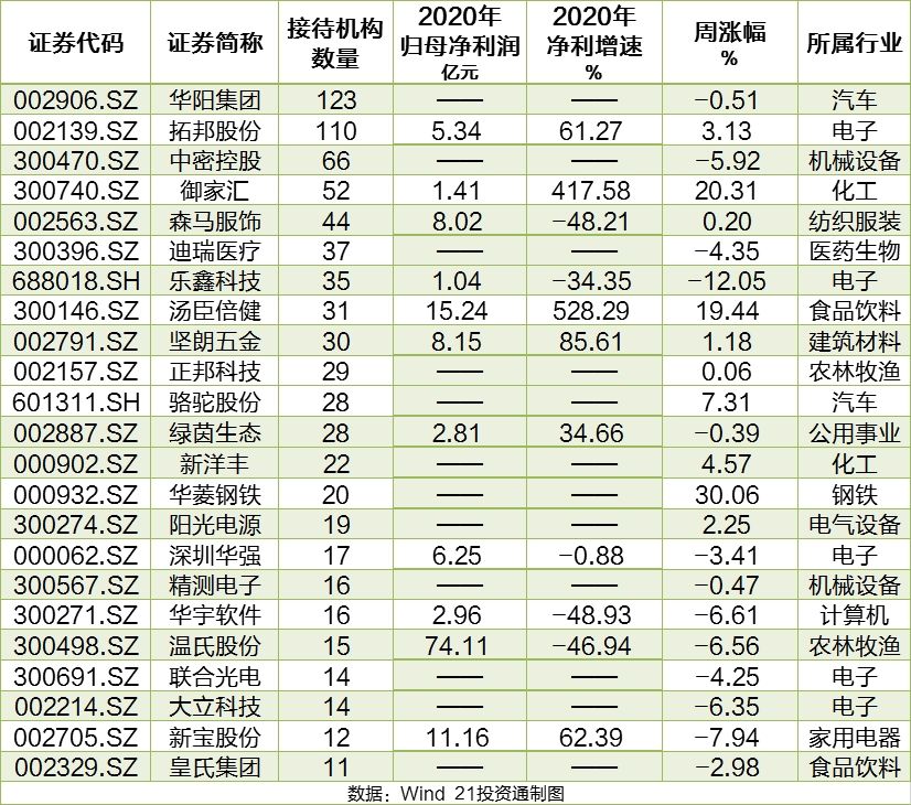 从公司来看,有23家公司获10家以上机构调研,其中华阳集团(002906.SZ)、拓邦股份(002139.SZ)获得超百家机构调研,分别为123家和110家。