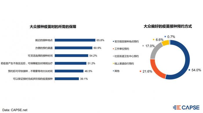 接种疫苗时,就近的接种地点、方便的预约渠道、可灵活选择的接种时间成为了大众对接种疫苗的三大主要需求;在接种疫苗的预约方式上,54%的人希望在官方指定接种地点预约,其次为单位预约。