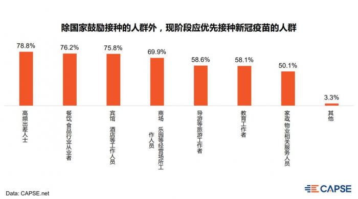 假如计划接种疫苗,那么,大众认为哪些人群应当优先接种?对接种疫苗的所需保障、预约方式方面又有哪些考量?CAPSE数据显示:除国家鼓励接种的人群以外,大众认为现阶段高频出差人士,餐饮/食品,住宿行业的工作人员应优先接种新冠疫苗,其次商场/乐园等经营场所工作人员也可优先接种新冠疫苗。