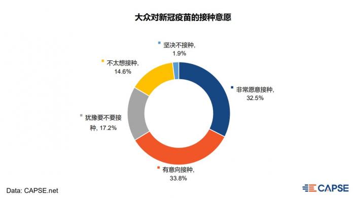 同时,大众对新冠疫苗的接种意愿较强:有66%的人愿意接种新冠疫苗。复旦大学附属华山医院感染科主任张文宏曾在第11届财新峰会论坛上表示:全民接种疫苗比例超过60%才有用。接受央广记者采访时,张文宏建议大众接种新冠疫苗的最佳时间在今年年内,同时以高危人群先打为原则。从本次调研结果来看,高达66%的接种意愿对于我国国内疫情防控来说是极为有利的。