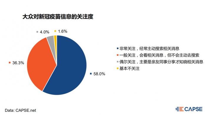 作为提振大众出行信心的一项重要举措,大众对新冠疫苗的关注度和接种意愿如何?调研显示:大众对疫苗的关注度很高,58%的人非常关注新冠疫苗的消息,经常主动获取相关信息。