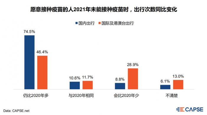 相较国内出行,是否接种疫苗对国际及港澳台出行影响更大。倘若愿意接种疫苗的人在2021年未能成功接种疫苗,国际及港澳台出行中,仅有46%的人出行次数仍会比2020年多,29%的人出行次数会比2020年更少。