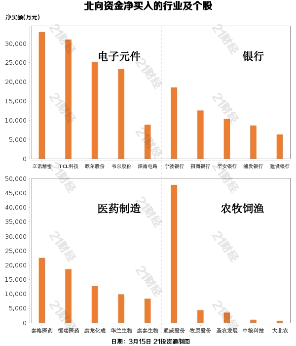 据21投资通(微信号ID:touzit21)智能监测,3月15日,北向资金净买入36.87亿元,其中沪股通净买入13.92亿元,深股通净买入22.95亿元。