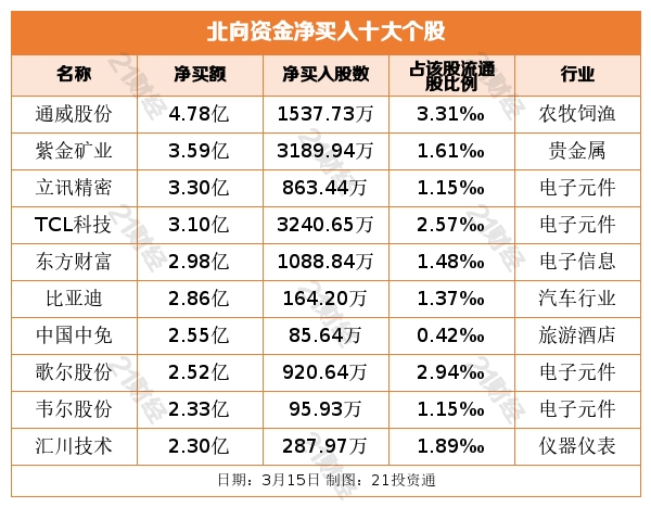 个股方面,北向资金净买入通威股份(600438.SH)、紫金矿业(601899.SH)、立讯精密(002475.SZ)、TCL科技(000100.SZ)、东方财富(300059.SZ)居前,其中,通威股份被净买入4.78亿元,紫金矿业被净买入3.59亿元,立讯精密被净买入3.30亿元,TCL科技被净买入3.10亿元,东方财富被净买入2.98亿元。