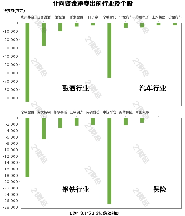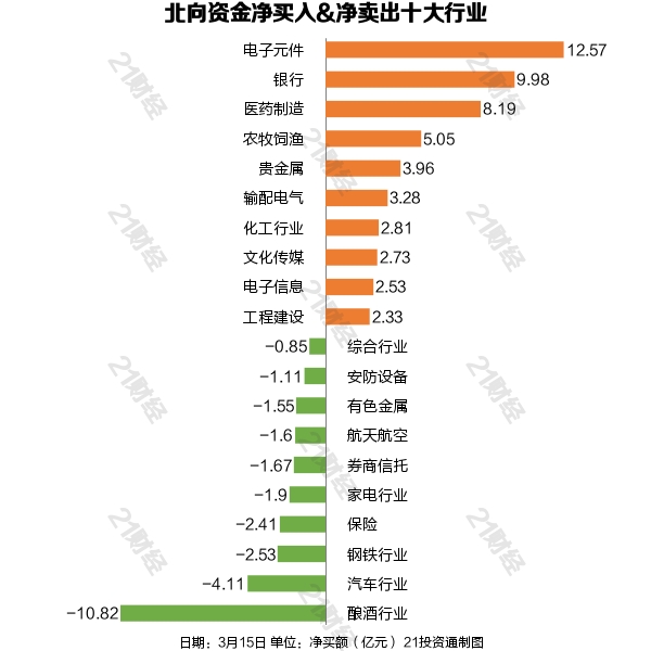 北向资金减持了26个行业,其中酿酒行业最多,净卖出金额达10.82亿元,其次是汽车行业,净卖出4.11亿元。