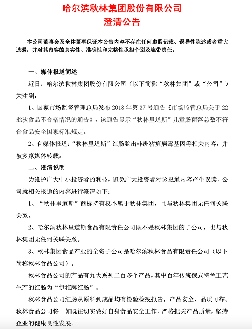 哈尔滨秋林食品厂则更名为哈尔滨秋林食品有限责任公司(下称“秋林食品公司”)。2012年,秋林食品公司回归至秋林集团旗下,成为其全资子公司。