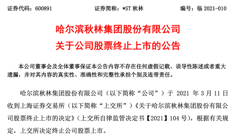 3月11日晚,秋林集团(股票代码:600891)发公告称,公司于2021年3月11日收到上交所《关于哈尔滨秋林集团股份有限公司股票终止上市的决定》,根据有关规定,因业绩连续三年亏损,上交所决定终止公司股票上市。