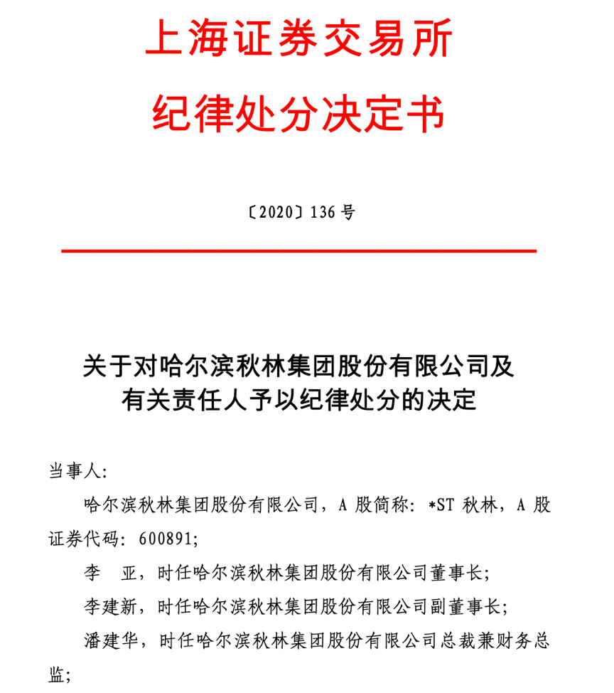 2020年3月,上交所对秋林集团时任董事长李亚、时任副董事长李建新予以公开谴责,并公开认定李亚、李建新10年内不适合担任上市公司董事、监事和高级管理人员等。