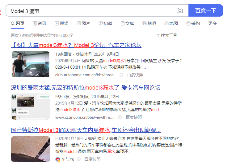 特斯拉做工的粗糙,极大地影响了车主的驾驶体验。有车主表示自己的Model 3在雨天中行驶一段时间后车内就会漏水,甚至有的车主发现A柱上方的喇叭片都出现锈迹。通过在网上搜索Model 3漏水的相关信息,很轻易地就找到了大量车主投诉与吐槽信息,漏水几乎成为国内特斯拉Model 3的通病。