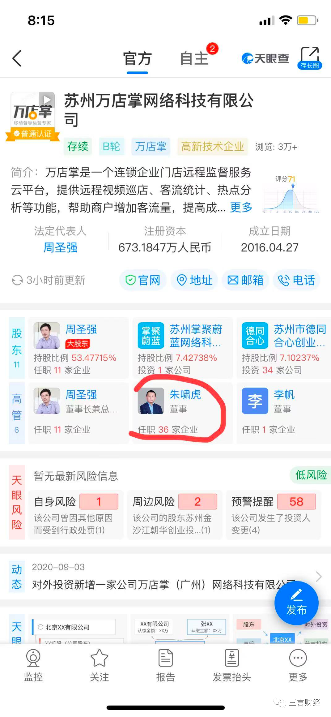 目前,金沙江创投董事总经理朱啸虎本人为万店掌董事。最终持股比例为0.0362%。而朱啸虎的金沙江创投也是万店掌的第四大股东。