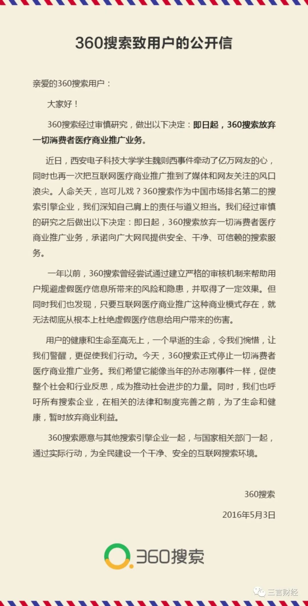 值得注意的是,当年魏则西事件发生后,360曾发布公开信宣布放弃一切医疗商业推广业务。周鸿祎还在朋友圈表示,“赚钱没错,但不能谋财害命”。
