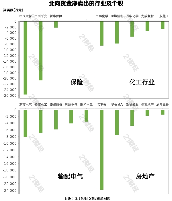 北向资金减持了22个行业,其中保险最多,净卖出金额达4.59亿元,其次是化工行业,净卖出3.36亿元。