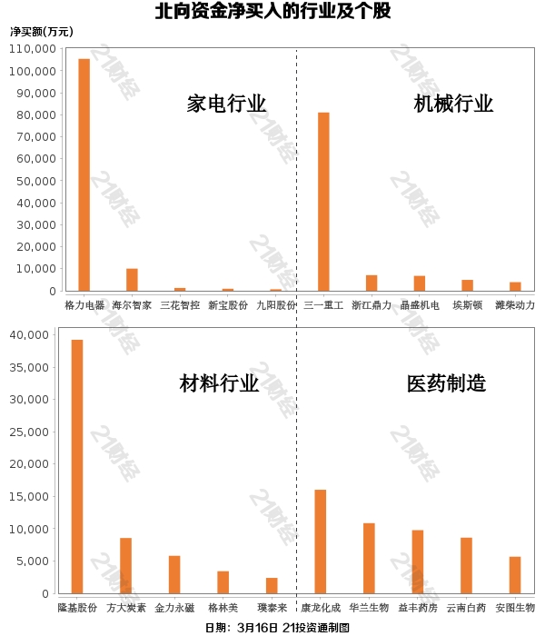 个股方面,北向资金净买入格力电器(000651.SZ)、三一重工(600031.SH)、五粮液(000858.SZ)、隆基股份(601012.SH)、亿纬锂能(300014.SZ)居前,其中,格力电器被净买入10.54亿元,三一重工被净买入8.11亿元,五粮液被净买入5.17亿元,隆基股份被净买入3.92亿元,亿纬锂能被净买入3.66亿元。