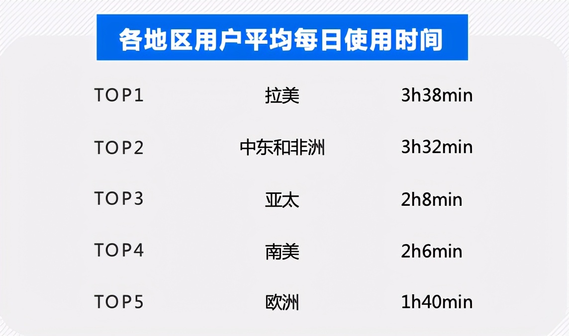 具体来说,新兴市场对互联网娱乐社交产品的需求巨大,平均使用时长(拉美3h38min、中东和非洲3h32min、亚太2h8min、南美2h6min)明显高于欧美(欧洲1h40min)等国家、地区。