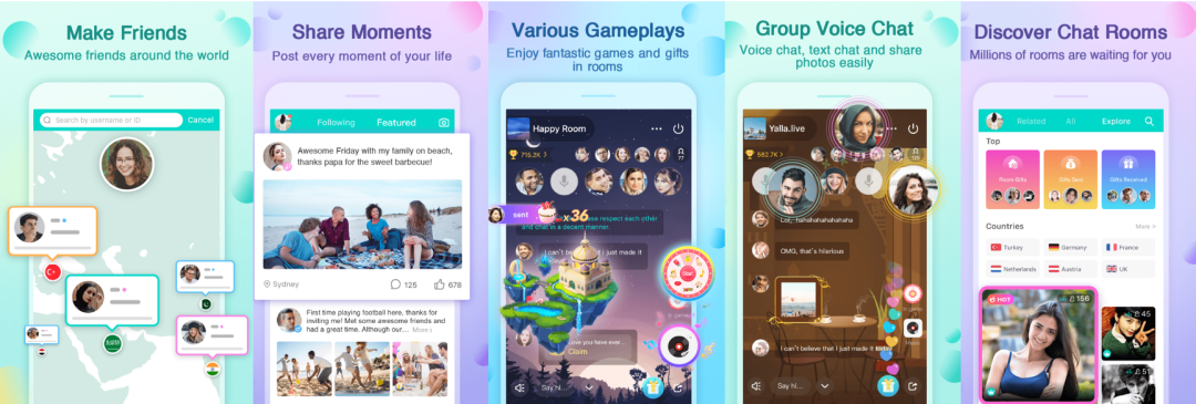 主要功能有匹配交友、聊天、动态(朋友圈)、直播等,是中东、东南亚、印巴地区的主流社交平台。2019年进军北美市场,2020年开拓日韩、欧洲市场,目前全球累计用户超过1亿,登上92个国家和地区社交畅销榜前十。商业模式为虚拟物品购买(用于直播打赏)、会员订阅、高级功能购买等。