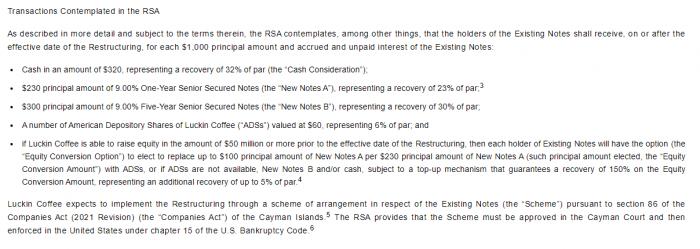 第二部分,这份公告中披露,如果在重组生效日前瑞幸能够获得5000万美元或以上的股本,每个现有的票据持有人将可以选择以美股存托股票的形式,最多每230美元新票据A的本金金额替换100美元新票据A的本金金额。