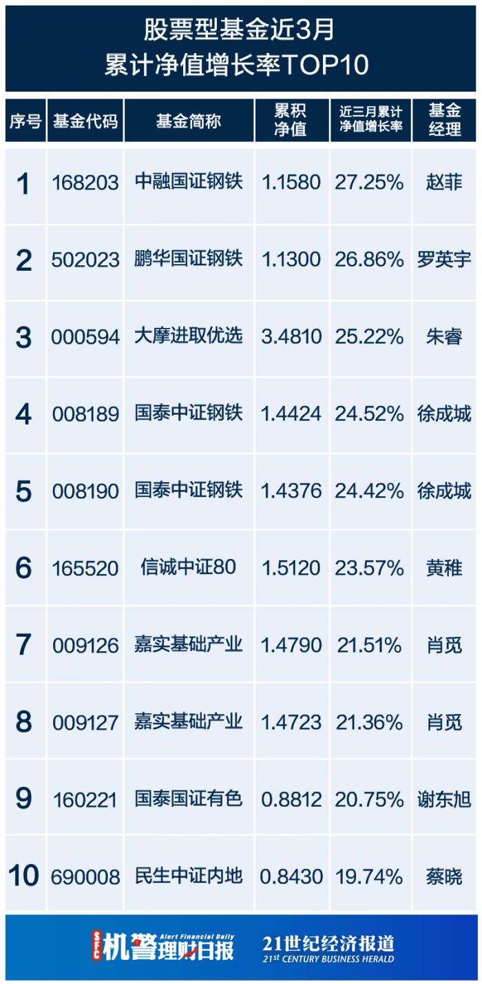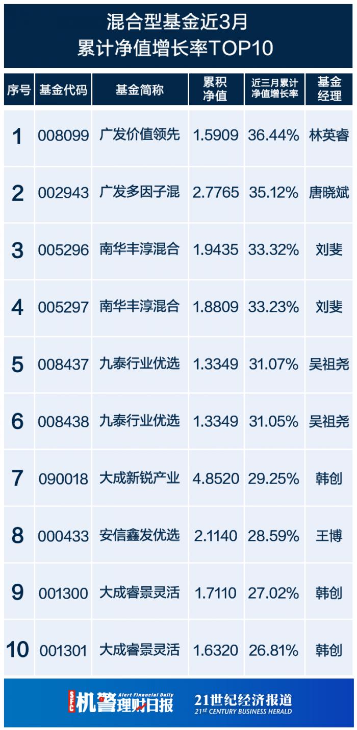 1、南财理财通【基金风云榜】基金近3月累计净值增长率TOP10