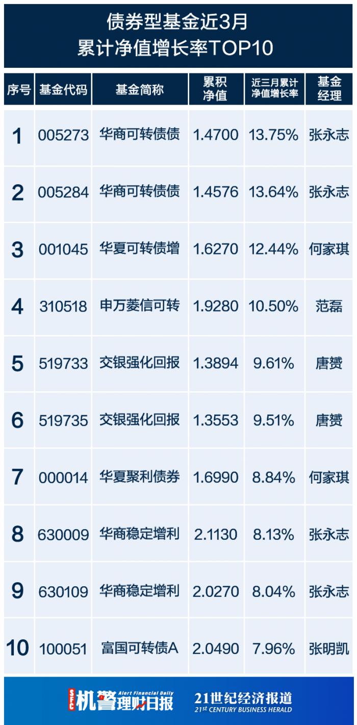 今日债券型基金榜单中,从近3月累计净值增长率来看,增长率最高的前10位产品包括华商可转债债券A、华商可转债债券C、华夏可转债增强债券A等。其中,华夏聚利债券于前10位中累计净值最高,为2.113;持仓方面,其股票仓位百分比达41.59%,持仓占比前三为东方财富、先导智能、中远海控;评级方面,济安金信评级5星,上海证券评级2星。