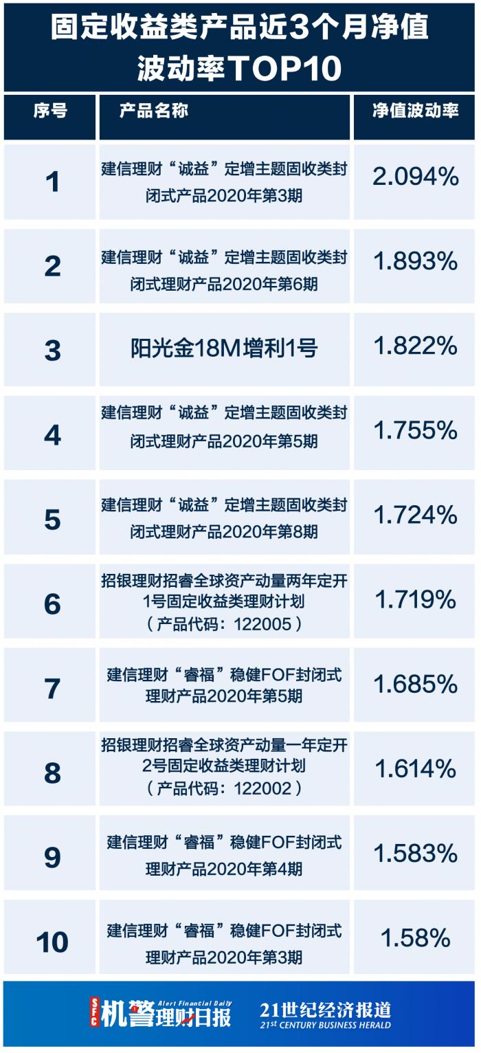 根据南财理财通数据,在理财子公司已发产品中,近3个月固定收益类产品波动率排行榜,净值波动率最大的前10位产品包括建信理财“诚益”系列、“睿福”稳健FOF系列、阳光金18M增利系列、招银理财招睿系列。其中建信理财占据7个席位,招银理财占据2个席位,光大理财各占据1个席位。净值波动率最大的为建信理财“诚益”定增主题固收类封闭式产品2020年第3期。这些产品波动率较高,投资者在关注收益指标的同时,也应关注风险指标,双向对比。