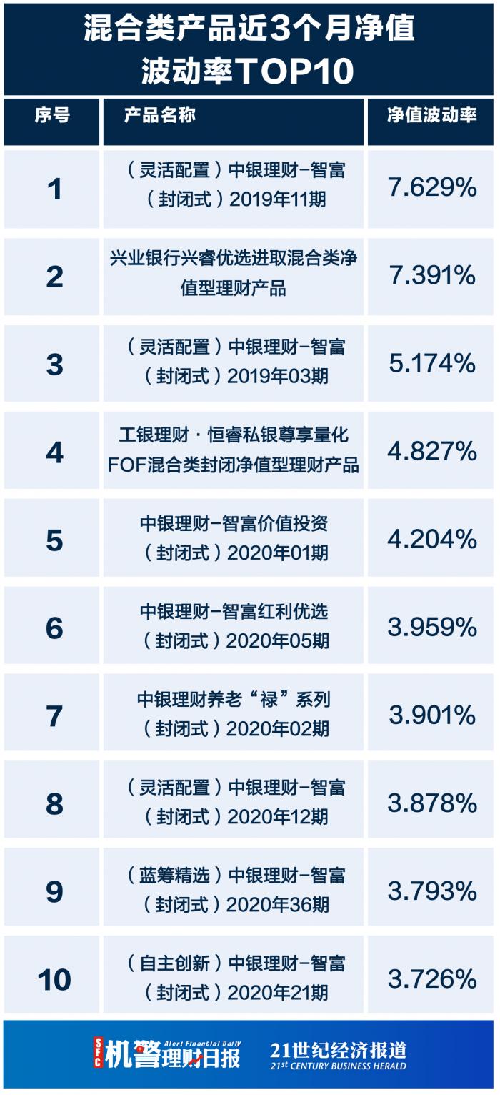 根据南财理财通数据,在理财子公司已发产品中,近3个月混合类产品波动率排行榜,净值波动率最大的前10位产品包括中银理财智富系列、智富价值投资系列、智富红利优选系列、养老“禄”系列、工银理财恒睿系列、兴业银行兴睿优选系列。其中中银理财占据8个席位、工银理财占据1个席位、兴业银行占据1个席位。净值波动率最大的为(灵活配置)中银理财-智富(封闭式)2019年11期。从数据上看,混合类产品的波动率远高于固定收益类,这是因为混合类产品中往往在期权、股票等权益类资产的配比高于固收类,固收类权益类资产配比不能超过20%,混合类可以超过20%,导致波动率和收益率均较高。《机警理财日报》每周选取不同指标,经过大数据筛选,对产品进行深度测评,不定期发布收益型榜单、风险型榜单和服务评价型榜单。