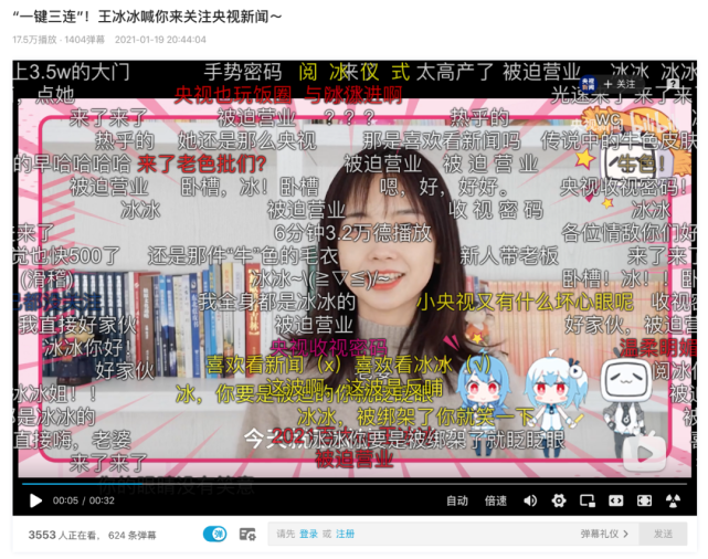 之前,王冰冰还在自己的B站账号发布视频,喊粉丝关注@央视新闻,引导粉丝“一键三连”,网友们调侃冰冰“被迫营业”。