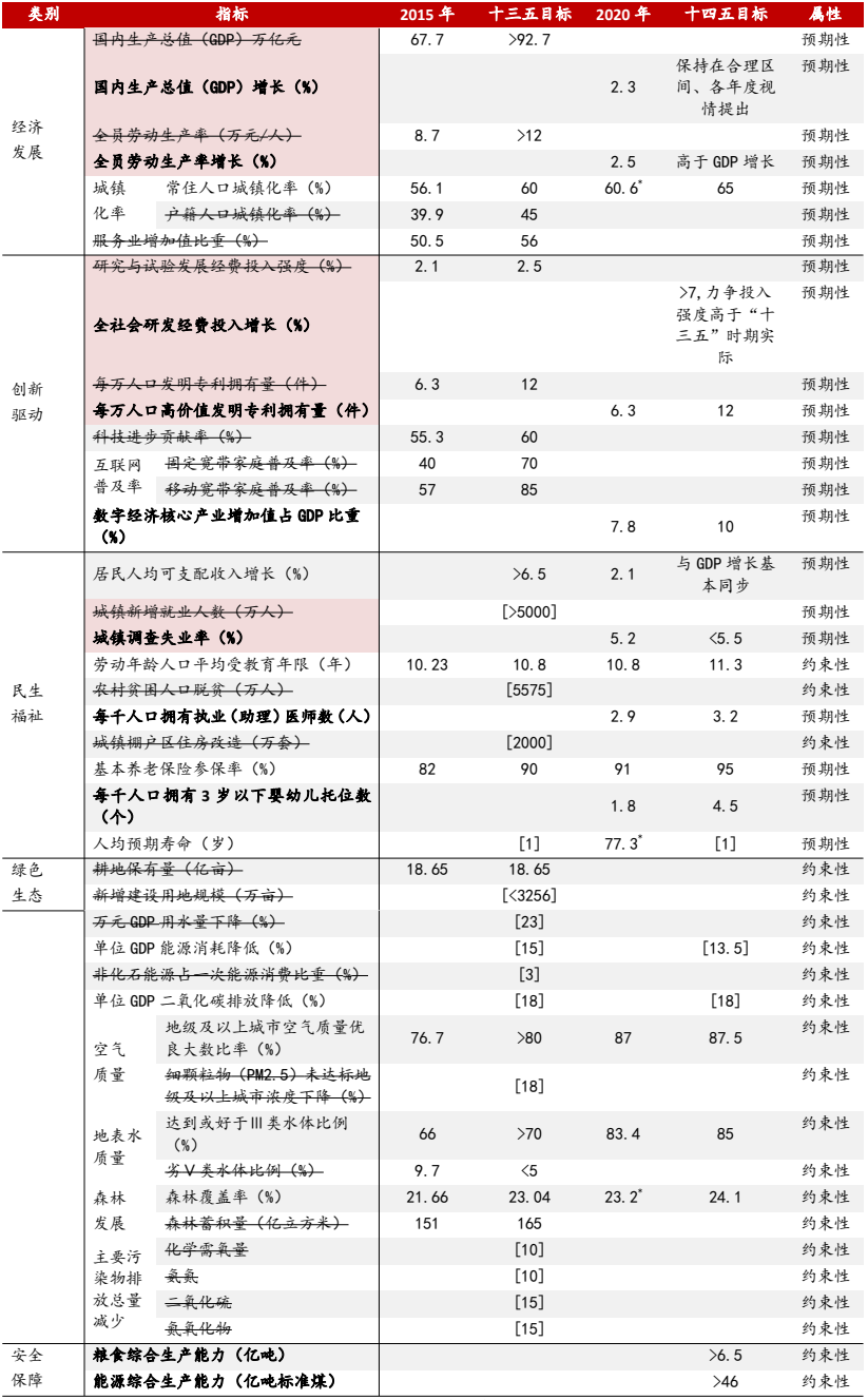 在高质量发展的要求之下,“十四五”期间的量化指标体系较“十三五”有所调整:一是新增了5项指标,包括粮食和能源安全,数字经济核心产业增加值占GDP比重、每千人口拥有执业(助理)医师数和每千人口拥有3岁以下婴幼儿托位数;二是调整了5项目标口径,包括GDP增速、城镇调查失业率、全员劳动生产率增长、研发经费投入增长、每万人口高价值发明专利拥有量,总体上更注重增长目标而非绝对值;三是删除了部分已经完成或重要性下降的指标,包括户籍人口城镇化率、服务业增加值比重、科技进步贡献率、农村贫困人口脱贫数、城镇棚户区改造套数、新增建设用地规模等。
