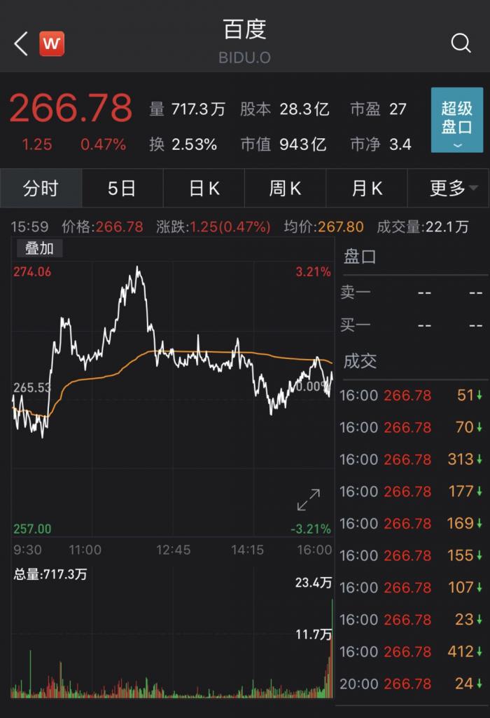 百度周二美股收市报266.78美元,总市值为943亿美元。