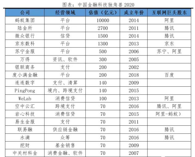 从国内现有的行业格局来看,国内金融科技的市场结构趋向于少数大型企业主导。《2020胡润全球独角兽榜》显示,这些头部机构包含蚂蚁集团、陆金所、微众银行、京东数科、银联商务等在内18家金融科技“独角兽”,其总估值已达到16340亿元。