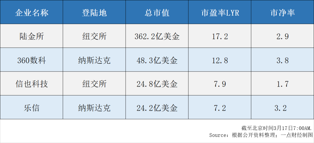 市净率方面,目前美股市场中几家中国金融科技企业的PB集中在1.5~3.8之间,其中,360数科PB为3.8,乐信为3.2,陆金所为2.9,信也科技为1.7。而美国本土金融科技企业的PB却较中概股高出数倍、甚至数十倍,如做风险评估(主地产贷款和保险精算)的VRSK为10.4,机构服务供应商PayPal为14.6,信贷服务机构Afterpay为18.5,信用指数评级公司SPGI更是高达164.9。