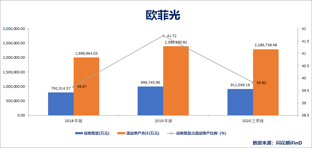除此之外,在各大厂商供应链中,欧菲光并不具备议价优势。欧菲光存货虽高,但应收账款金额更高。2018年至2020年前三季度,欧菲光应收账款分别为79.23亿元、99.67亿元和91.10亿元,占流动资产比例分别为39.67%、41.72%和39.83%。