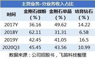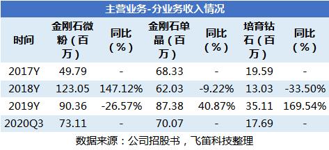据力量钻石招股书披露的最新数据,截至2020年三季度,公司实现收入1.66亿元,扣非净利润为3933万元。从往年的数据看,2019年,力量钻石实现收入2.21亿元,同比增长8.66%,增速较2018年下滑,同期实现扣非净利润5982万元,同比下降1.26%。
