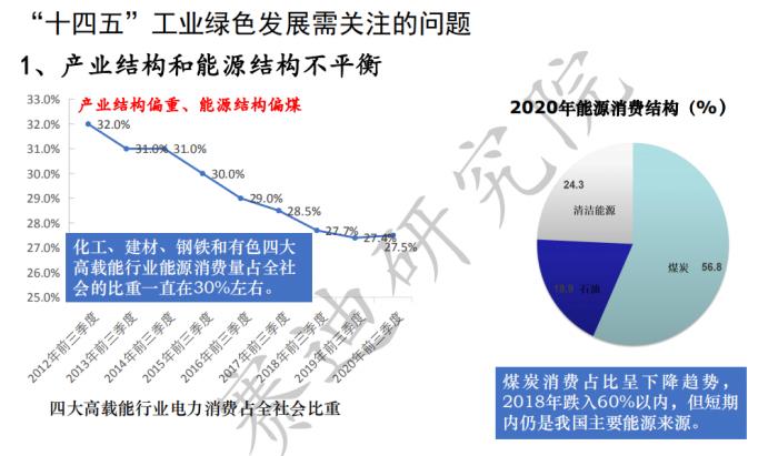 “十四五”工业绿色发展需要关注的一个问题是:产业结构和能源结构不平衡,当前中国产业结构偏重、能源结构偏煤。当前化工、建材、钢铁和有色四大高载能行业能源消费量占全社会的比重一直在30%左右。煤炭消费占比虽呈下降趋势,2018年跌入60%以内,但短期内仍是我国主要能源来源。