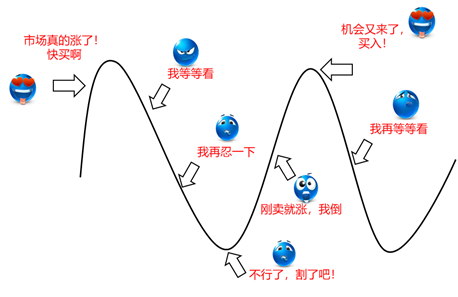 其实,大家面对下跌时的心态,小爱非常感同身受。一碰到大跌,心里就发慌,看着账户,掰着手指头算今天又跌掉了多少辛苦钱。人总是厌恶亏损的,哪怕只是“潜在亏损”,越是在这种时候越容易做出一些不够理性的决策,比如:一碰到亏损,就想卖出;一遇到上涨,就想加仓。短视、贪婪,只要投资者还有任何一个弱点,都会被市场无限放大从而攻击。下图恐怕就是无数基民心理的真实写照。