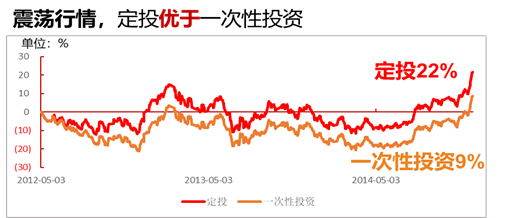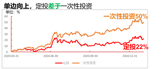纵观A股市场表现,大抵还有另外2种形态,分别是下跌和上涨。下跌行情中,定投的收益率都是明显高于一次性投资的;上涨的行情,定投效果逊于一次性投入。但A股“牛短熊长”的特点较为明显,回调和震荡的时间一般较长,上涨时间短,所以,总体而言,A股市场大部分时间都是适合定投策略的。简而言之,除非你坚定地认为市场会一路上涨,否则,在其他所有市场行情下,定投都是你的最优解。