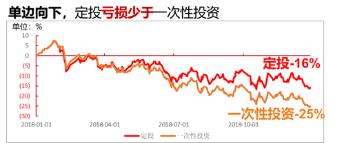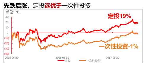 尤其是当前市场已经调整这么多了,大家对后市都比较谨慎,担心进一步下跌怎么办。其实,在“先跌后涨”的行情中,定投优势更加明显。就拿15年下半年到17年底来说,定投的收益率高于一次性投资20个百分点。