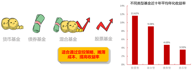 把高收益高波动的特征落实到基金类型中的话,那混合型和股票型基金更适合定投。当然,具体到每个人选择基金的话,也不是收益率和波动率越高越好,小伙伴们最好根据自己的风险承受能力,选择自己熟悉的、能拿得住的基金才最重要。
