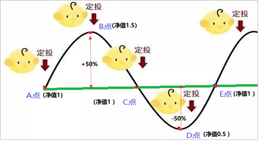 为什么价格回到原点,反而能获利呢?看起来很不可思议。一起用数学的方法来验证一下吧(PS:不喜欢数学的小伙伴请直接忽略此段,记住上述结论就好)。假设图中B点和D点的涨跌幅均相等,当净值回到原点(E点)时的收益情况如何?显然,一次性买入4元的收益率为0%;但定投,当价格上涨到B点时,1元可买到1÷1.5=0.67份;当价格下跌到D点时,1元可买到1÷0.5=2份,经过前4个阶段的积累,你一共投入了4块钱,却获得了“1+0.67+1+2=4.67份”,当价格涨到一块钱时,定投收益率为16.75%。不用惊心动魄,不用每天盯盘,原地不动就把钱挣了。