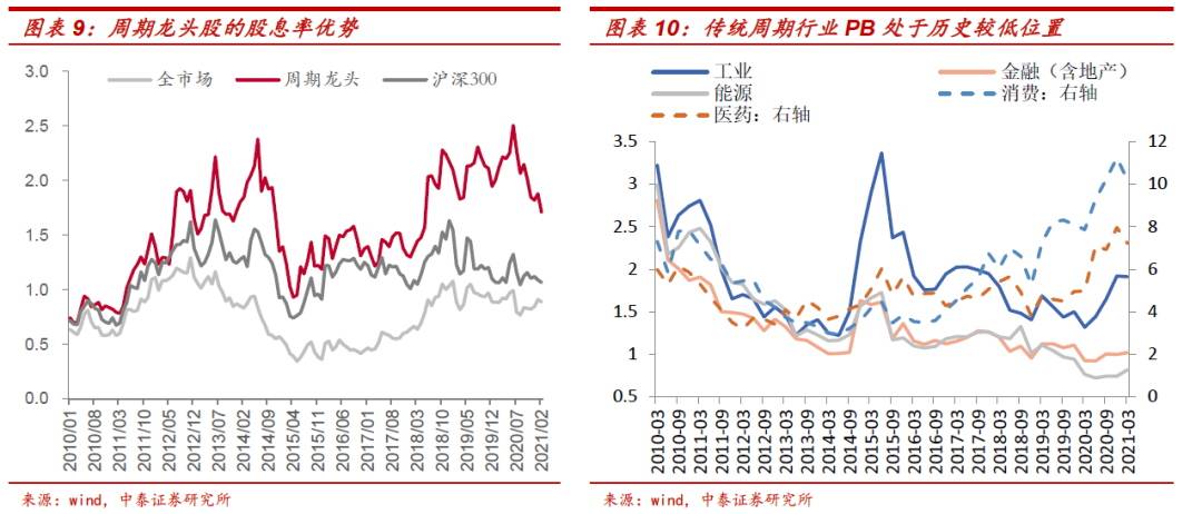 从PB看,工业、能源以及金融地产等传统行业的估值仍处在历史较低水平,与消费、医药等行业相比,估值差更是处于历史极低值。从股息率来看,周期龙头股的吸引力也非常明显。