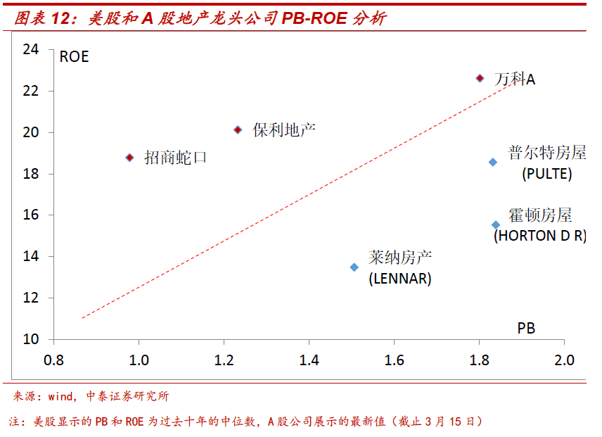 从PB-ROE看,三家A股地产龙头公司明显处于左上方,即相对具有更高的ROE和更低的PB,估值优势明显。