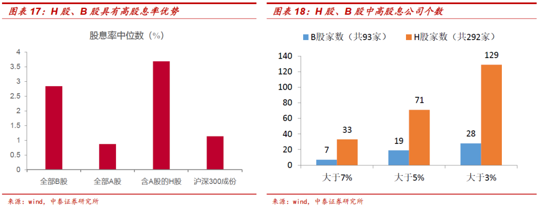 与此同时,H股和B股中金融和周期股较多,股息率优势明显。H股及B股的股息率中位数远高于A股市场平均水平以及沪深300指数。93家B股公司中,54家公司股息率超过3%,其中7家股息率超7%;292家H股公司中,233家公司股息率超过3%,其中33家股息率超7%。