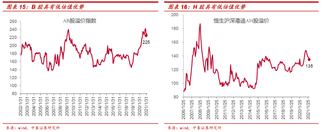 H股和B股相对A股大幅折价,具有较高的性价比和安全边际。恒生沪深港通AH股溢价指数最新为135(截止2021年3月15日),按照同样编制方法计算的AB股溢价指数约为225,这意味着A股相对H股的平均溢价水平为35%(只计算同时具有A股和H股的公司),而相对B股的平均溢价率125%(同样只计算同时具有A股和B股的公司)。