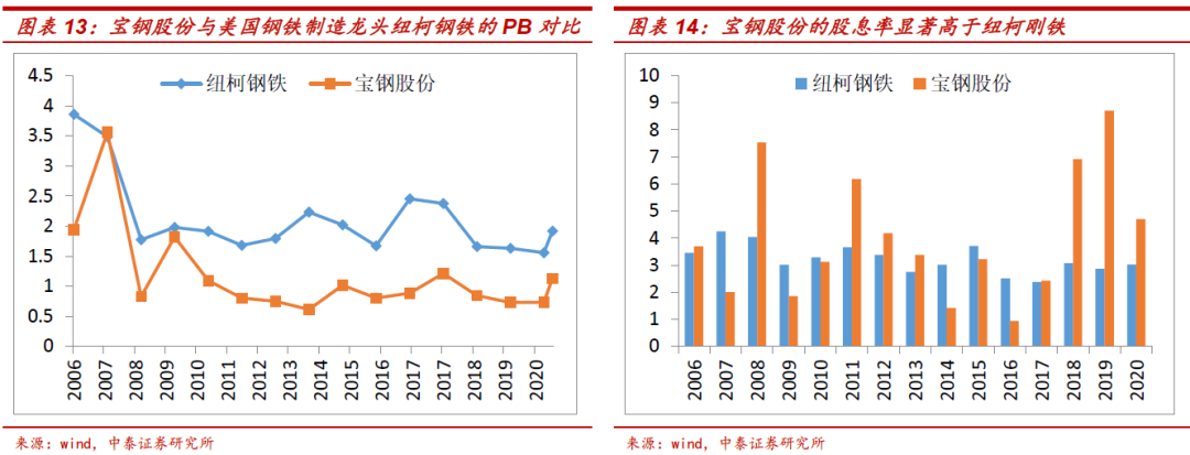 钢铁行业选取了美国最大的钢铁制造公司纽柯钢铁,其生产的钢铁产品线较全,与国内的钢铁龙头具有较高的可比性。但值得说明的是纽柯钢铁主要采用电炉炼钢(主要原材料是废钢),而宝钢主要是高炉炼钢(主要原材料是铁矿石),工艺流程方面还是存在一些差异。从PB和股息率对比来看,宝钢股份估值明显低于纽柯钢铁,而股息率更高。