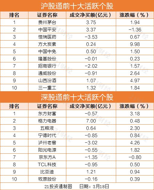 十大活跃个股方面,格力电器、贵州茅台、中国平安、三一重工净买入居前,分别获净买入7.00亿元、3.75亿元、3.37亿元、1.32亿元。