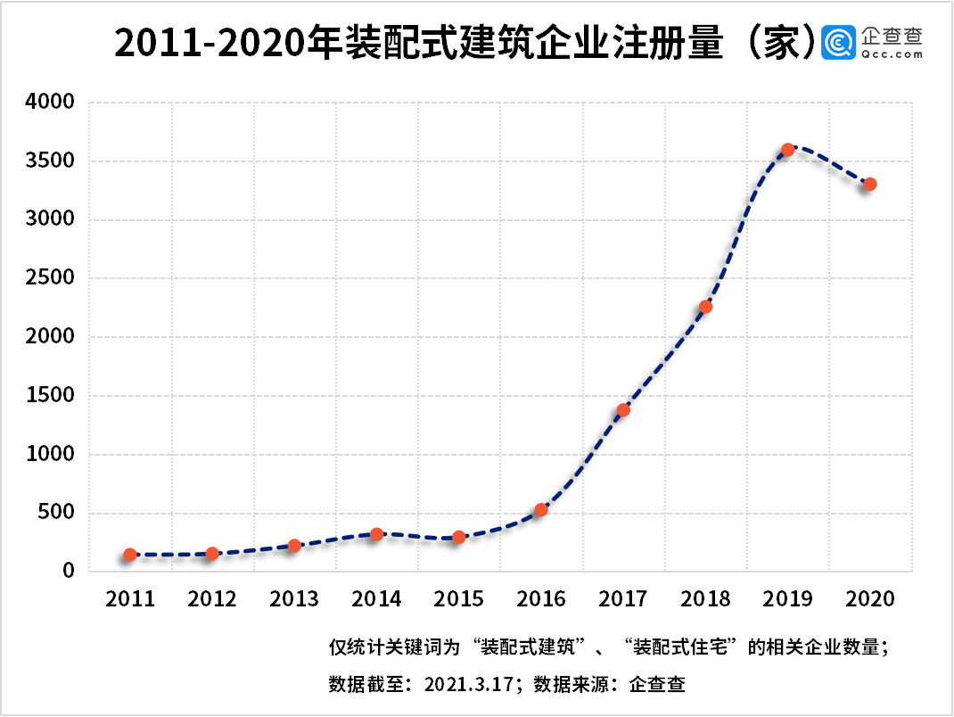 2011年以来的十年之间,装配式建筑企业注册量逐年增长。企查查数据显示,2011年新注册企业143家,2016年开始行业进入高速增长期,2019年注册量达到十年来最高的3594家,同比增长59%。2020年注册量降至3301家,同比下降8%。