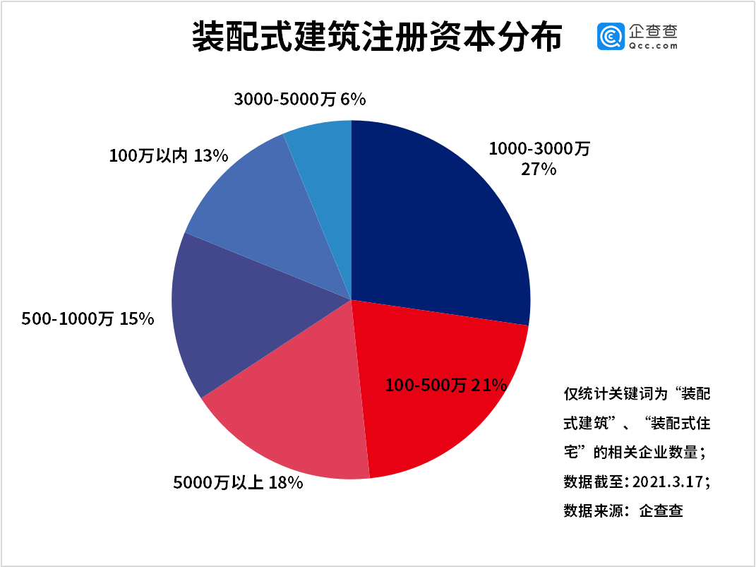 企查查数据显示,装配式企业中个体户数量较少,仅占2%。从注册资本来看,装配式建筑企业注册资本普遍较高,注册资本在1000-3000万元的装配式建筑企业最多,占27%,注册资本在100-500万元和5000万元以上的分别占21%和18%。