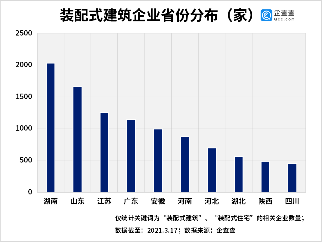 从省份分布来看,企查查数据显示,湖南省的装配式建筑企业数量最多,达2032家,山东、江苏、广东和安徽则分别以1658家、1252家、1148家和996家相关企业排名全国前五位。