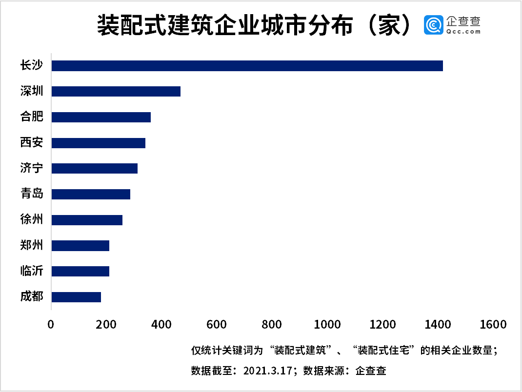 从城市分布来看,企查查数据显示,长沙市的装配式建筑企业数量遥遥领先,共1418家。此外,排名前五的还有深圳、合肥、西安和济宁,企业数量分别有468家、361家、340家和313家。