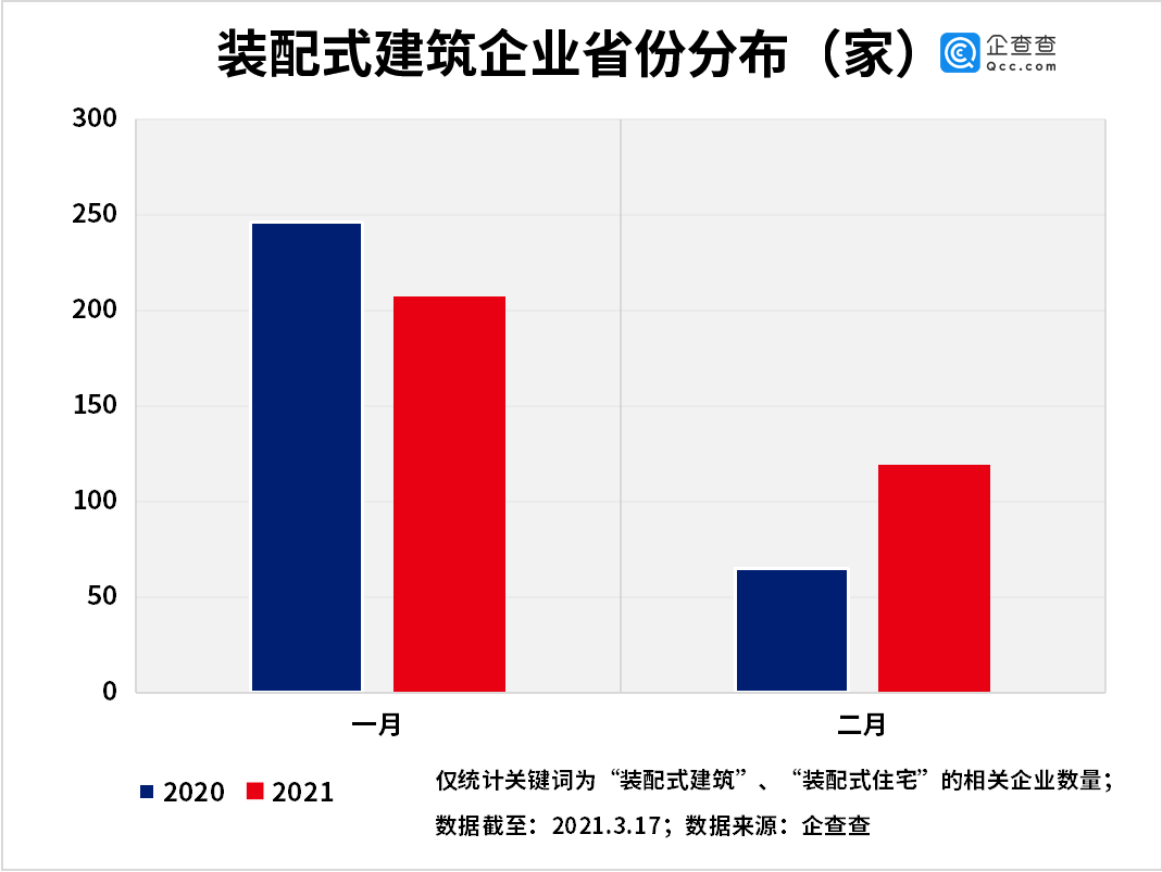 企查查数据显示,2021年前两个月共注册装配式建筑相关企业326家,同比增长5%。其中, 2月份共注册119家,同比增长83.1%,环比减少42.5%。