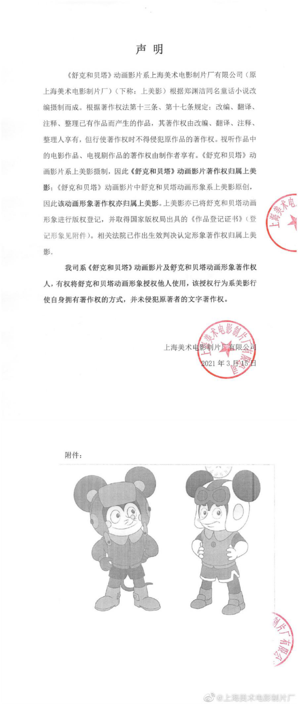 时间到2019年11月,郑渊洁在微博发布了一则版权声明,总结了这些年与美影厂的版权纠纷,并且对向美影厂取得《舒克贝塔》商业版权授权的商家们强调:“《舒克贝塔》乃本人于1982年开始连载的童话小说,而我于1989年授权上美厂的也仅限于动画的改编制作,并不包括所谓的衍生品销售”。